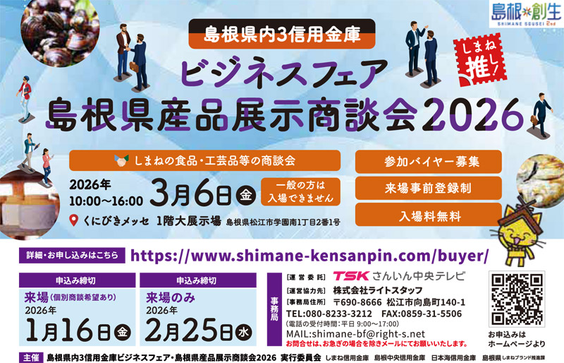 「島根県内3信用金庫ビジネスフェア・島根県産品展示商談会2026:くにびきメッセ(松江市)」の