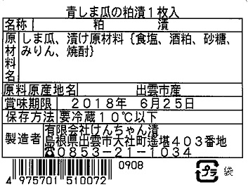 | 原材料 | しま瓜(島根県産)、漬け原材料(酒粕、砂糖、食塩、本みりん、焼酎) |