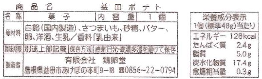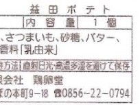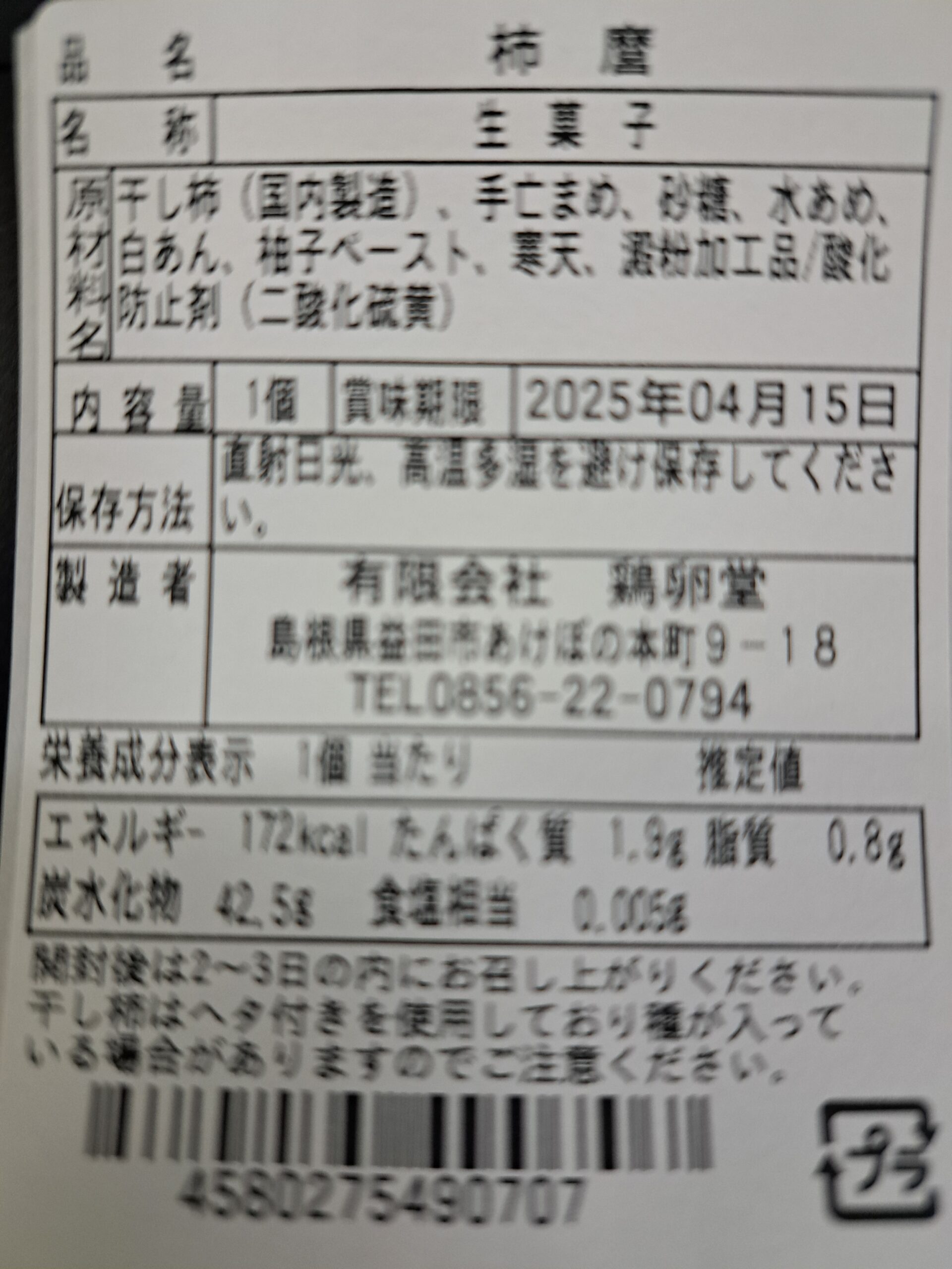 | 原料の産地 | 干し柿(島根県産)、手亡豆(北海道産)、砂糖(アメリカ・キューバ)、水飴(国産)、白餡(アメリカ・オーストラリア)、柚子ペースト(国産)、食塩(国産)、寒天(国産) |