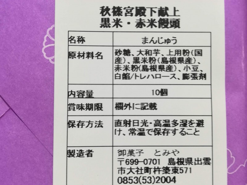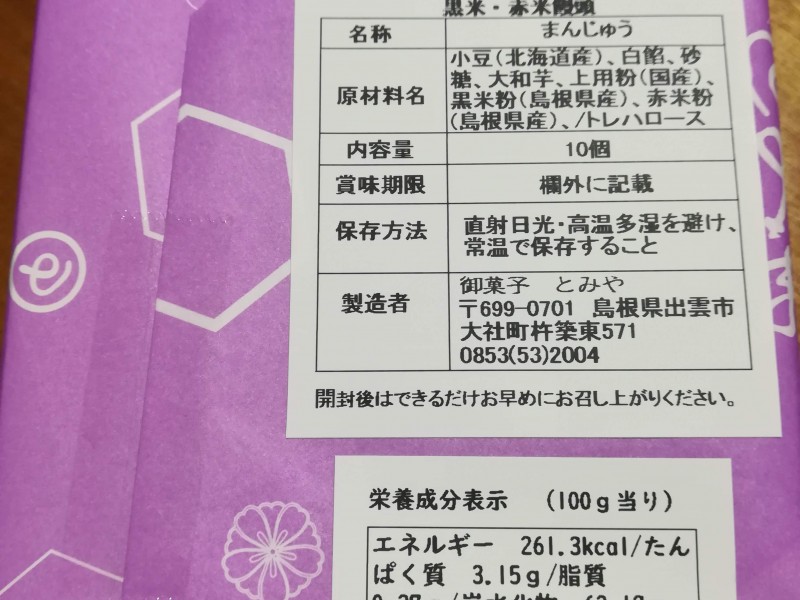 | 原材料 | 砂糖、大和芋、上用粉、黒米粉、赤米粉、小豆、白餡/トレハロース、膨張剤 |