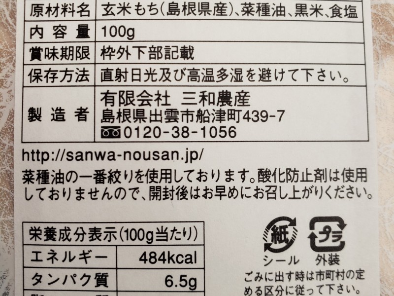 | 原材料 | もち米、菜種油、食塩、古代米(黒米) |