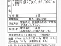 | 原材料 | 砂糖(国内製造)、小豆、白生餡(いんげん豆)、小麦粉、山芋、卵白(卵を含む)、 小麦でんぷん、還元水飴、還元麦芽糖水飴、麦芽糖/ベーキングパウダー 着色料(黄4、黄5、青1、赤3、赤106) |