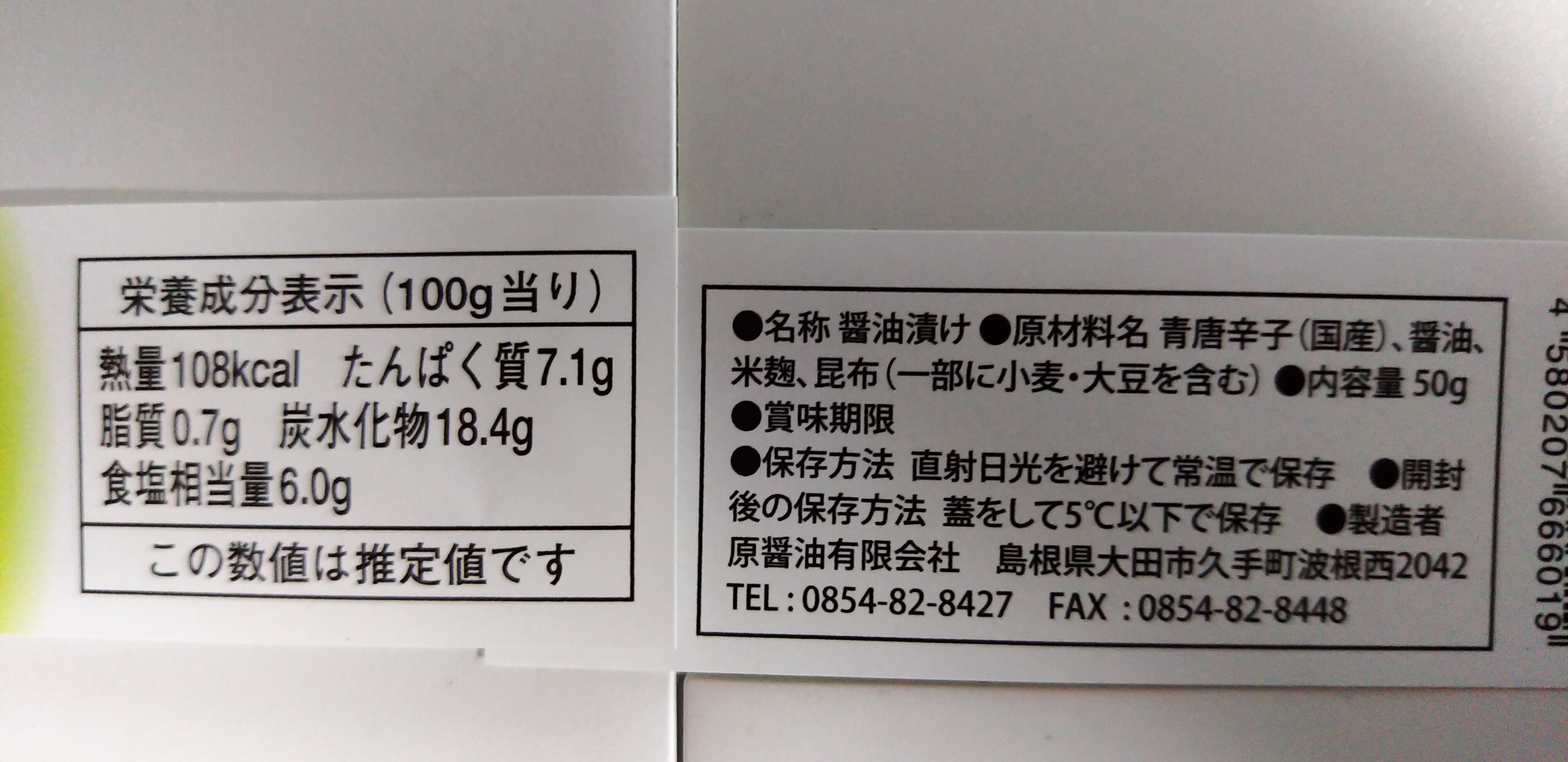 | 原材料 | 青唐辛子・醤油・米麹・昆布 |