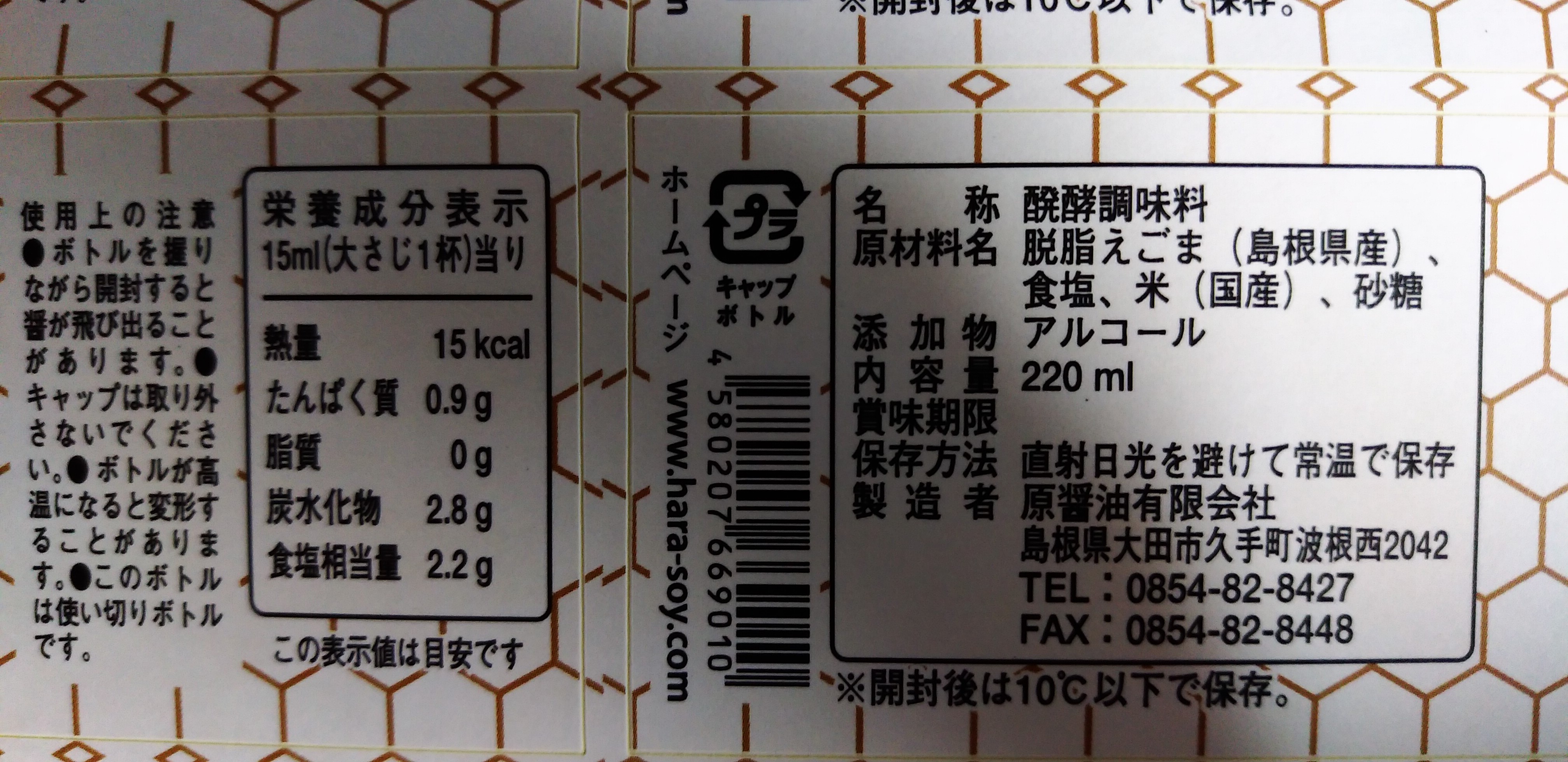 | 原材料 | 脱脂えごま・食塩・米・砂糖・アルコール |