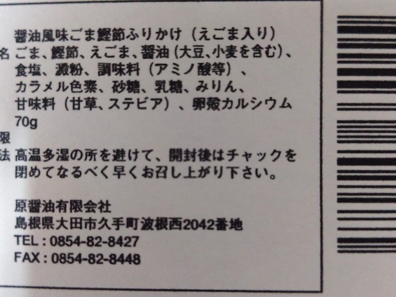 原材料 炒りごま、鰹節、えごま、食塩、醤油、澱粉、砂糖、みりん/調味料(アミノ酸等)、甘味料(甘草、ステビア)、カラメル色素、卵殻カルシュウム