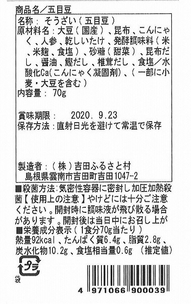 | 原材料 | 大豆、昆布、こんにゃく、人参、乾しいたけ、発酵調味料(米、米麹、食塩)、砂糖(甜菜)、昆布だし、醤油(小麦・大豆を含む)、鰹だし、椎茸だし、食塩/水酸化カルシウム(こんにゃく凝固剤) |