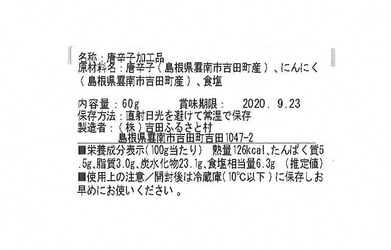 | 原料の産地 | 唐辛子(島根県)、にんにく(島根県) |