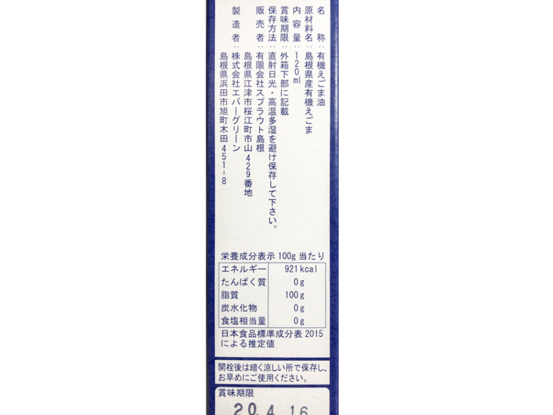 | 有機えごま油 | 120ml(110g) | 48本 |