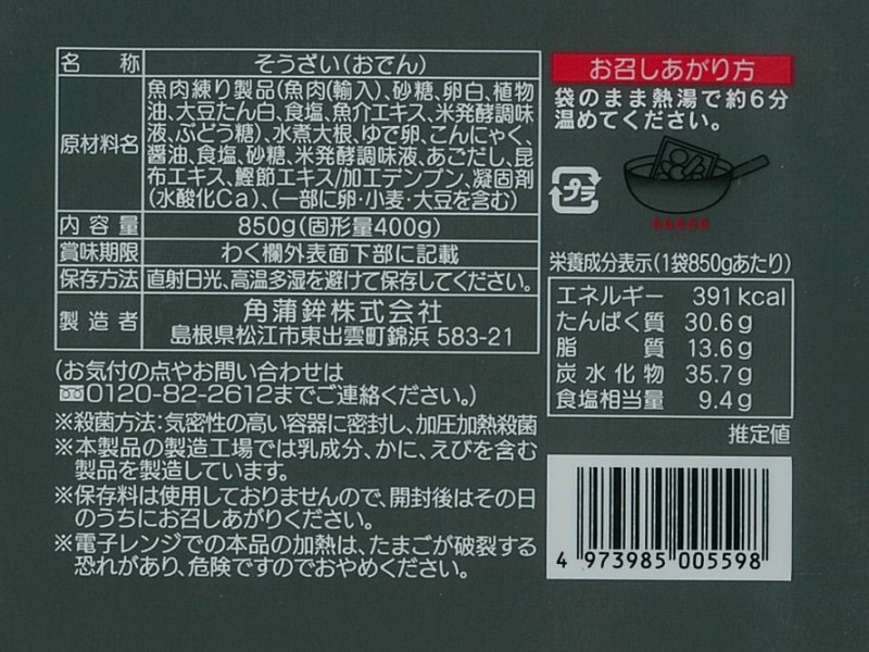 | 原料の産地 | 練製品(インド・ベトナム・アメリカ) 卵(国産) こんにゃく(国産) |
