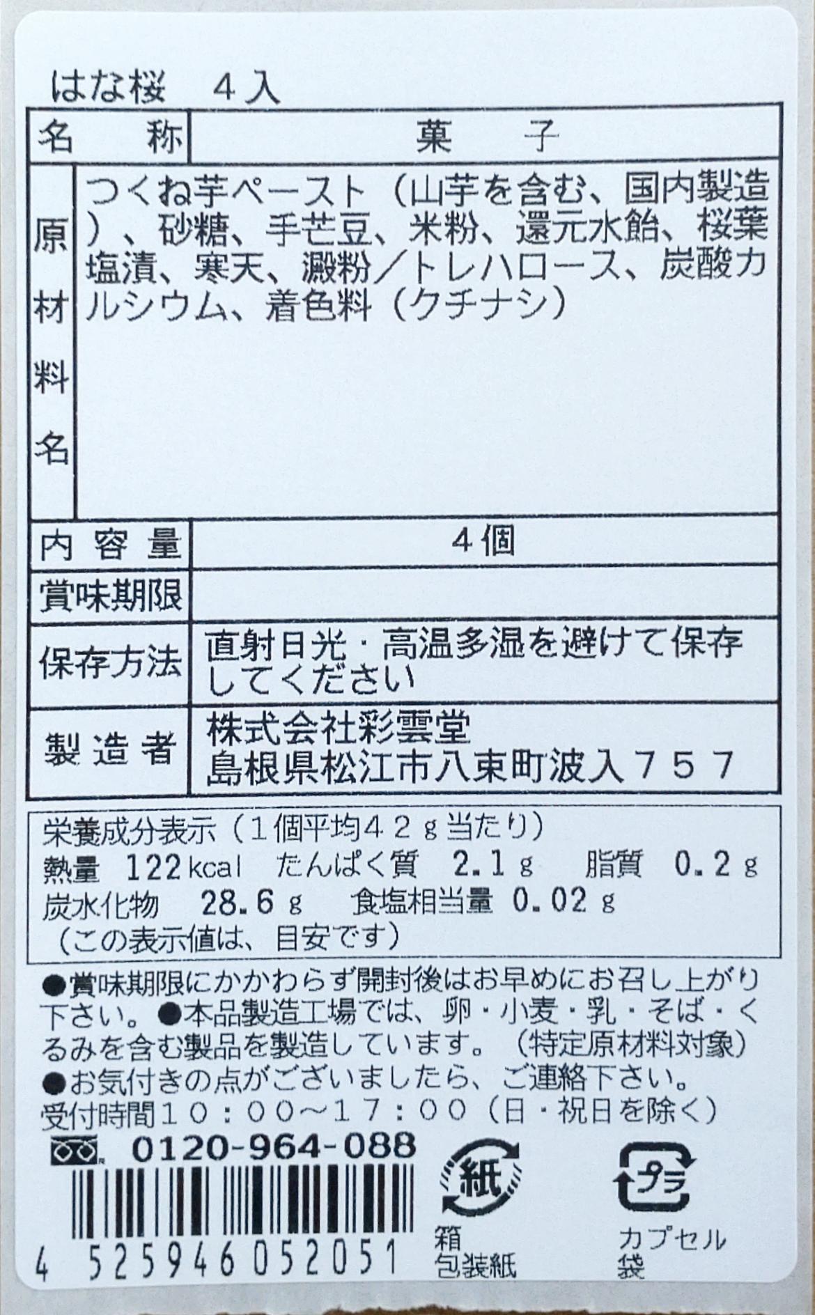 | 原材料 | つくね芋ペースト(山芋を含む、国内製造)、砂糖、手芒豆、米粉、還元水飴、桜葉塩漬、寒天、澱粉/トレハロース、炭酸カルシウム、着色料(クチナシ) |