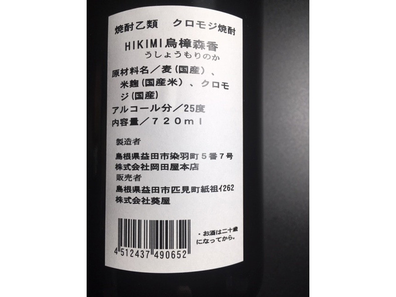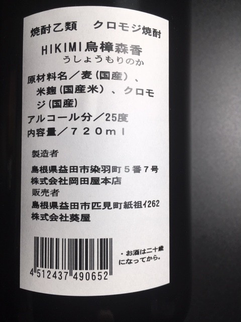 | 焼酎乙類 クロモジ焼酎 HIKIMI烏樟森香 | アルコール度数 25度 内容量 720ml | 6本入り又は12本入り |