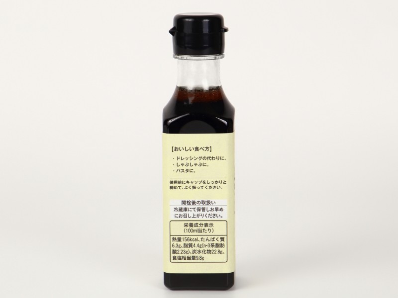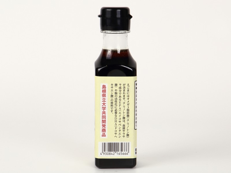 本醸造こいくちしょうゆをベースに島根県邑智郡川本町で作られたエゴマを使用し製造しました。αリノレン酸を普段の食事に気軽に取って欲しい思いから、島根県立大学と共同開発しました。