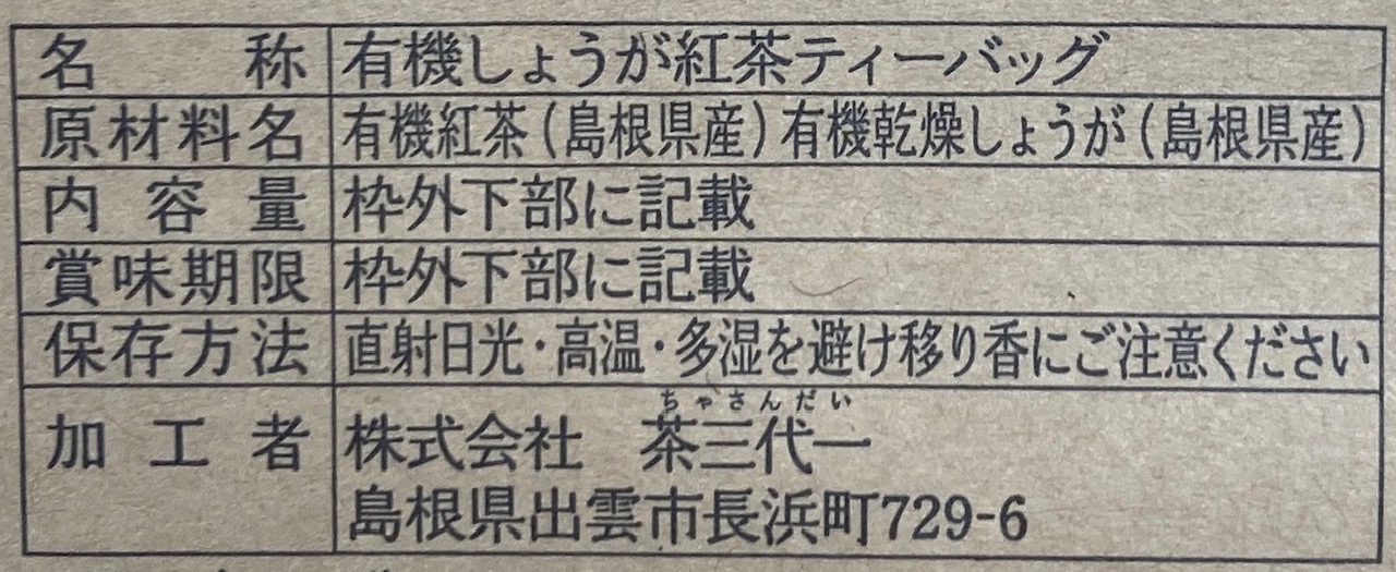 | 原材料 | 有機紅茶(島根県産)、有機乾燥しょうが(島根県産) |