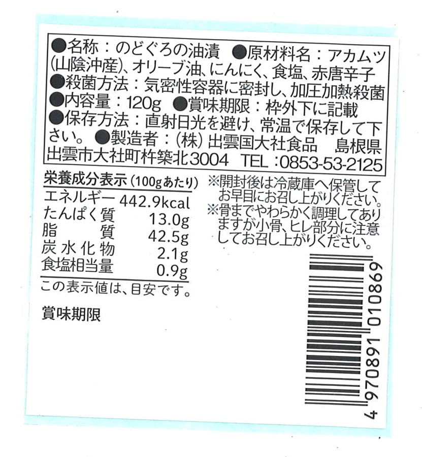 | 原材料 | アカムツ(山陰沖産)、オリーブ油、にんにく、食塩、赤唐辛子 |