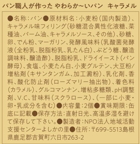 | 原材料 | キャラメル味の原材料 原材料名:小麦粉、ビターキャラメルペースト(砂糖混合異性化液糖、なたね油、パーム油、キャラメルソース、オリゴ糖シロップ、でん粉、砂糖、乳清たん白、乾燥卵白、食塩、小麦粉)、砂糖、卵、マーガリン、加工澱粉、乳酸菌発酵液(全粉乳、脱脂粉乳、乳たん白、でん粉)ぶどう糖、醸造調味料、でん粉、醸造酢、スキムミルク、ドライイースト、植物性たん白、食塩、/乳化剤、ビタミンC、増粘多糖類、糊料(グルコマンナン)、香料、着色料(カラメル)、pH調整剤、甘味料(スクラロース)、酸化防止剤(ローズマリー抽出物) (原材料の一部に乳成分、卵、小麦、大豆を含む。) |