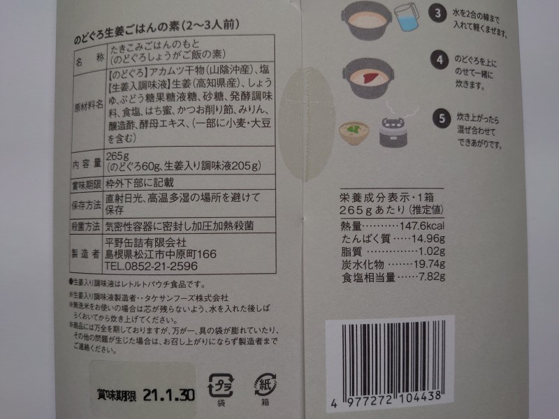 | 原材料 | 【のどぐろ】アカムツ干物(山陰沖産)、塩 【生姜入調味液】生姜(高知県産)、しょうゆ、ぶどう糖果糖液糖、砂糖、発酵調味料、食塩、はち蜜、かつお削り節、みりん、醸造酢、酵母エキス、(一部に小麦·大豆を含む) |
