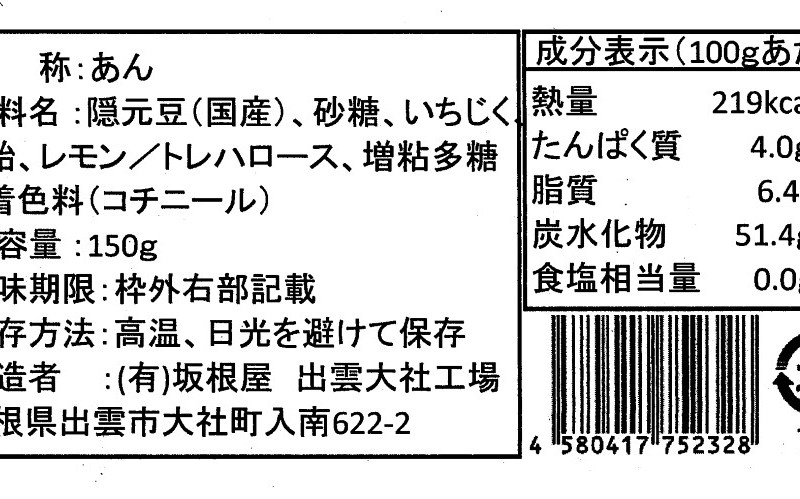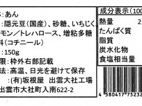 | 原料の産地 | イチジク(出雲産) 手芒豆 (北海道) 砂糖、水飴、トレハロース、増粘多糖類(国産原料、国内製造) |