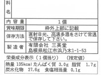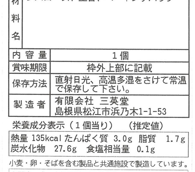 | 原材料 | 砂糖(国内製造)、卵、餅粉、小豆生餡(小豆)、小麦粉、白さらし餡、還元水飴、水飴、麦芽糖、植物油脂、山芋/トレハロース、重曹、ベーキングパウダー |