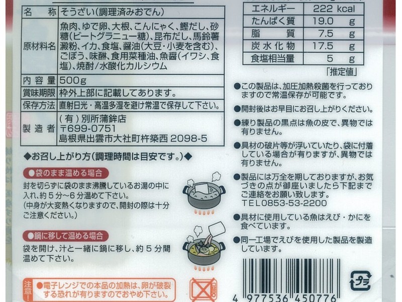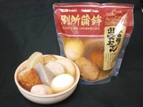 無リンすり身から製造した練り物5種と国産大根、有機こんにゃく、玉子(産んだ親鳥がエサに抗生剤未投与)の8種8個入りのレトルトおでんです。おでんだしは弊社の自社開発の自慢のおでんだしです。