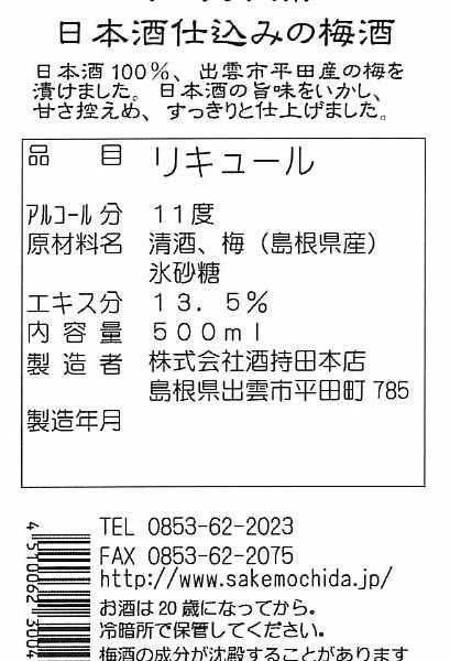 | ヤマサン正宗 日本酒仕込の梅酒(箱入) | 500ml | 15本 |