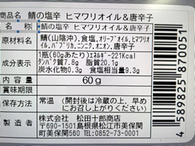 | 原材料 | マサバ(山陰沖)、食塩、オリーブオイル、ヒマワリオイル、パプリカ、ニンニク、オニオン、唐辛子 |