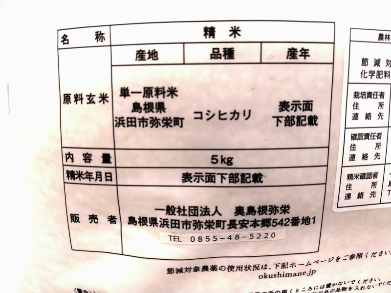| 原料の産地 | 精米 単一原料米 島根県浜田市弥栄町産 こしひかり |