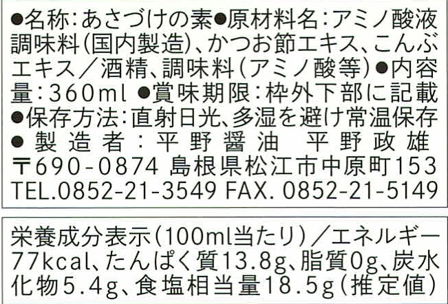 原材料 アミノ酸液調味料(国内製造)、かつお節エキス、こんぶエキス/酒精、調味料(アミノ酸等)