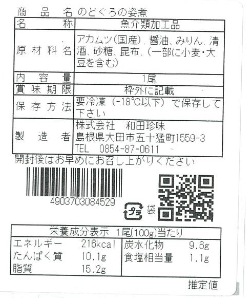 | 原材料 | アカムツ(国産)、醤油、みりん、清酒、砂糖、昆布、(一部に小麦・大豆を含む) |