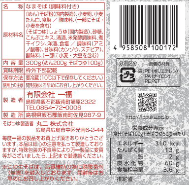| 原材料 | 【めん】そば粉(国内製造)、小麦粉、小麦たん白、食塩/酸味料、(一部にそば・小麦を含む) 【そばつゆ】しょうゆ(国内製造)、砂糖、こんぶエキス、清酒、米発酵調味料、煮干イワシ、洋酒、食塩/調味料(アミノ酸等)、甘味料(カンゾウ、ステビア)、酸味料、(一部に小麦・大豆を含む) |