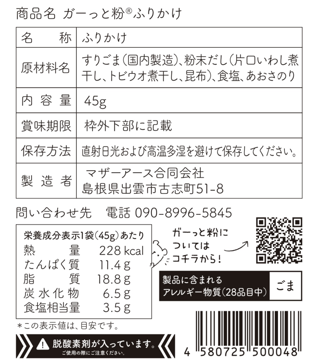 | 原材料 | すりごま(国内製造)、粉末だし(片口イワシ煮干し、トビウオ煮干し、昆布)、食塩、あおさのり |