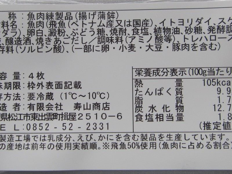| 原材料 | 魚肉(飛魚(ベトナム又は国産)、イトヨリダイ、スケトウダラ)、卵白、澱粉、ぶどう糖、焼酎、食塩、植物油、砂糖、醗酵調味液、醸造酒、焼きあごだし/調味料(アミノ酸等)、トレハロース、保存料(ソルビン酸)、(一部に卵・小麦・大豆・豚肉を含む) |