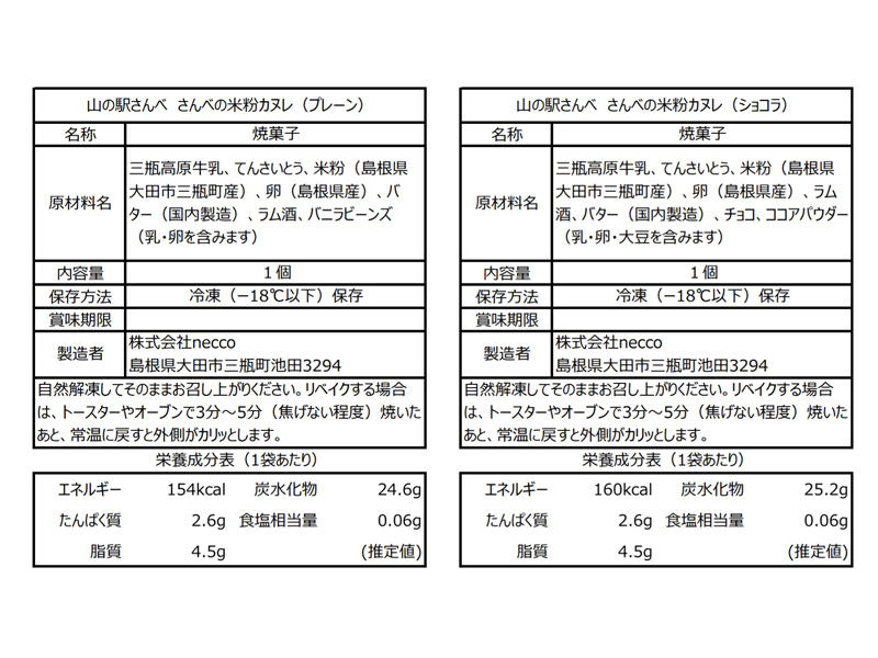 | 原材料 | 【プレーン】三瓶高原牛乳、てんさいとう、米粉(島根県大田市三瓶町産)、卵(島根県産)、バター(国内製造)、ラム酒、バニラビーンズ(乳・卵を含みます) 【ショコラ】三瓶高原牛乳、てんさいとう、米粉(島根県大田市三瓶町産)、卵(島根県産)、ラム酒、バター(国内製造)、チョコ、ココアパウダー(乳・卵を含みます) |