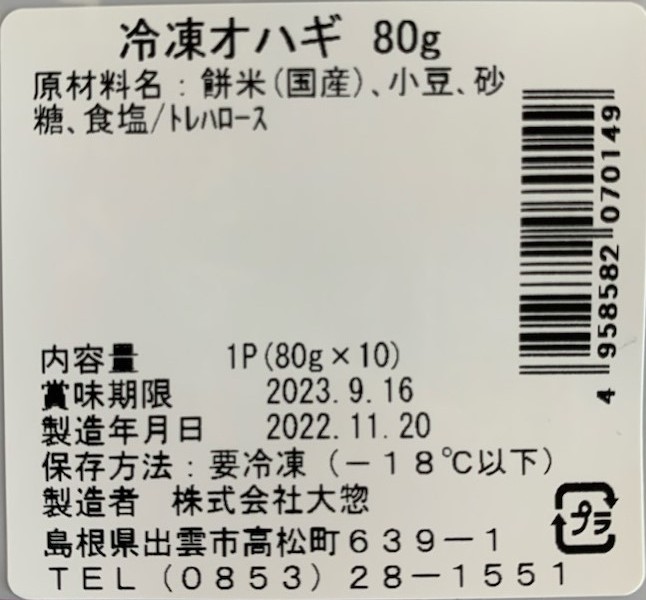 | 原材料 | 餅米(国産)、小豆、砂糖、食塩/トレハロース |