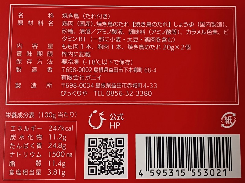 | 原材料 | 鶏肉(国産)、焼き鳥のたれ 【焼き鳥のたれ】しょうゆ(国内製造)、砂糖、清酒/アミノ酸液、調味料(アミノ酸等)、カラメル色素 、ビタミンB1(一部に小麦・大豆・鶏肉を含む) |