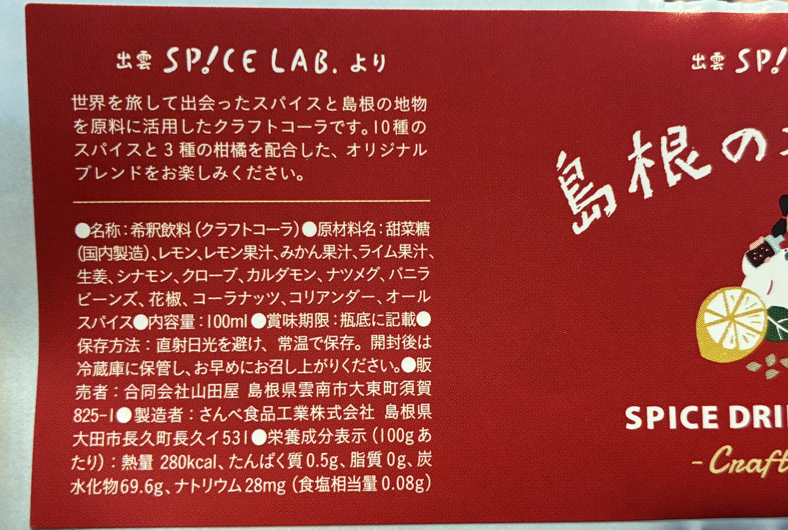 原材料 甜菜糖(国内製造)、レモン、レモン果汁、みかん果汁、ライム果汁、生姜、シナモン、クローブ、カルダモン、ナツメグ、バニラビーンズ、花椒、コーラナッツ、コリアンダー、オールスパイス