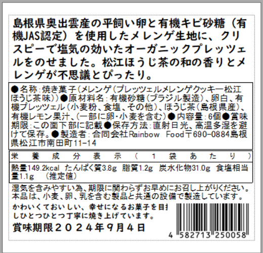 原料の産地 卵(島根県産)、有機キビ砂糖(ブラジル産)、有機プレッツェル(ドイツ製)、ほうじ茶(島根県産)、有機レモン果汁(イタリア産)