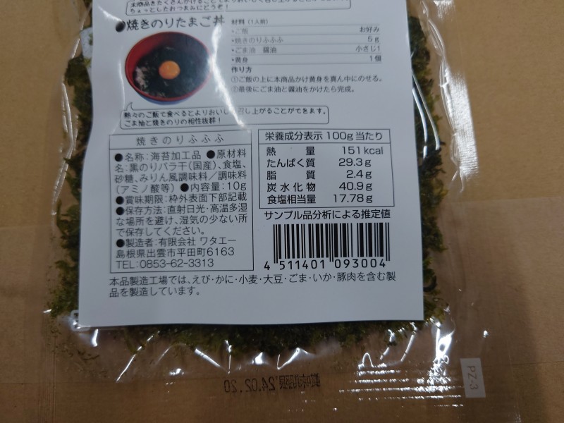 | 原料の産地 | 黒のりバラ干し(国内産) |