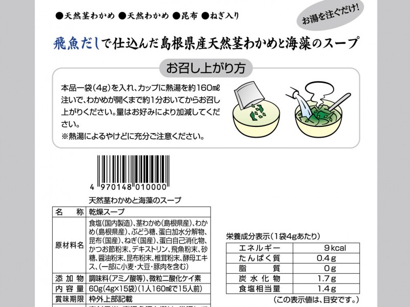 - 飛魚だしで仕込んだ島根県産天然茎わかめと海藻のスープ4g×9袋