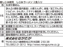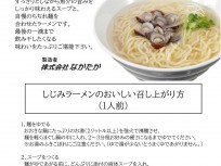 | 原材料 | 【めん】小麦粉(国内製造)、小麦たんぱく、食塩/加工でんぷん、酒精、ソルビット、かんすい、クチナシ黄色素、(一部に小麦を含む)【スープ】たん白加水分解物(国内製造)、食塩、砂糖、えびエキス(還元でん粉分解物、かにエキス、えびだし、食塩、砂糖、その他)、魚介エキス、ほたてエキス、しょうゆ、しじみエキス/調味料(アミノ酸等)、酸味料、カラメル色素、(一部に小麦・大豆・かに・えびを含む)【レトルトしじみ】大和しじみ(島根県宍道湖産) |