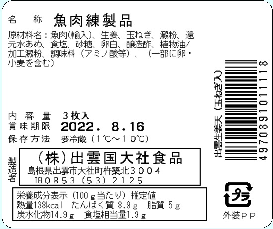 | 原材料 | 魚肉(輸入)、生姜、玉ねぎ、澱粉、還元水あめ、食塩、砂糖、卵白、醸造酢、植物油/加工澱粉、調味料(アミノ酸等)、(一部に卵・小麦を含む) |