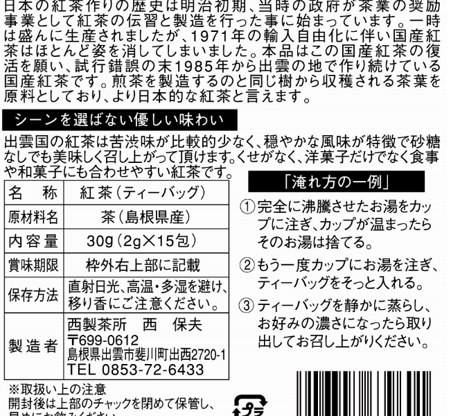 | 出雲国の紅茶 | 30g(2g×15P)ティーバッグ | 30個 |