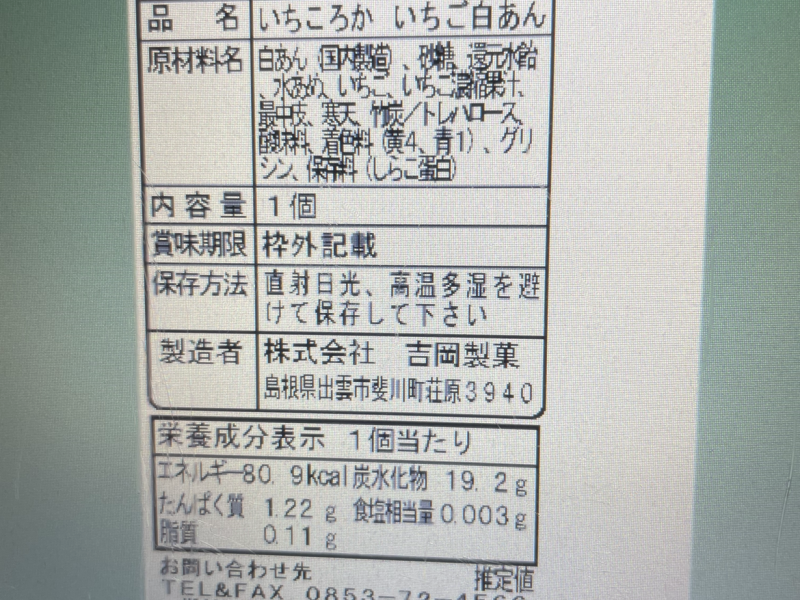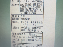 | 原材料 | 白あん(国内製造)、砂糖、還元水飴、水飴、いちご 、いちご濃縮果汁、最中皮、寒天/トレハロース、クエン酸、酸味料、香料、保存料(しらこたん白)、着色料(赤102、黄4、青1、金箱) |