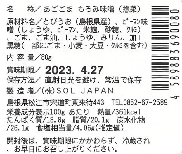 | あごごまもろみ味噌 | 80g | 1ケース18個 |