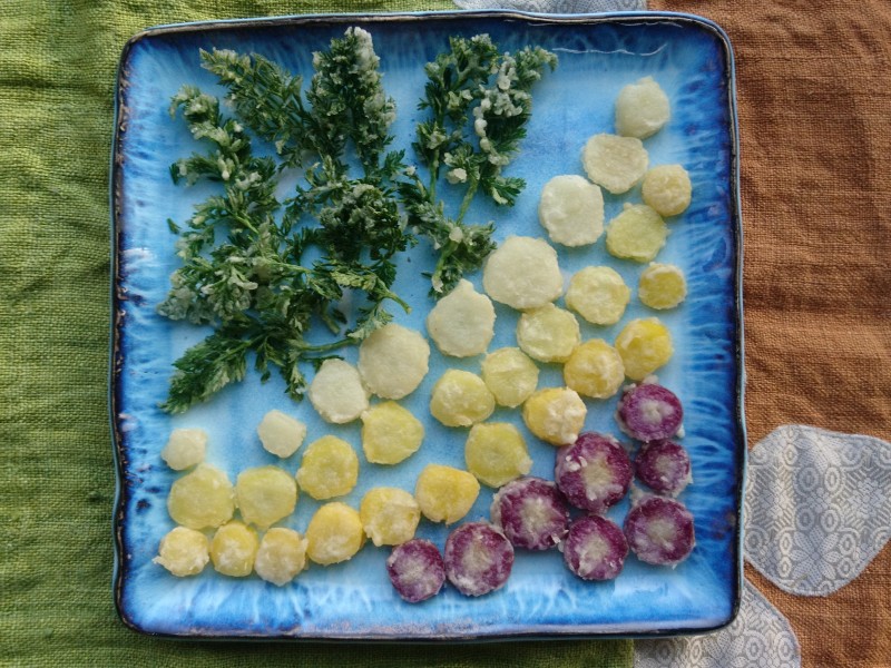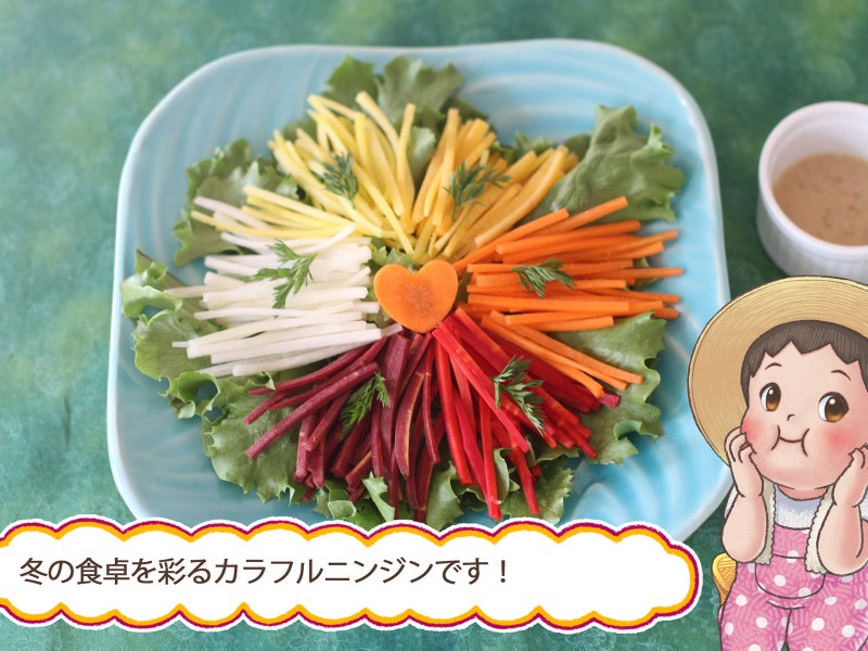 | おすすめメニュー | 生食でサラダなど食卓の彩りをアップさせるのが一番効果的です。 特に紫ニンジンは酢などの酸性素材を使ったドレッシングと相性が抜群で、アントシアニンの酸性反応でキレイな赤色を出すことができます。 また最も渋味や刺激が少ないクリームはペーストにしてスープにしたり、甘味の強い黄色はムースにしてデザートにしたりと、色に応じて様々な彩りを作り出すことができます。 |