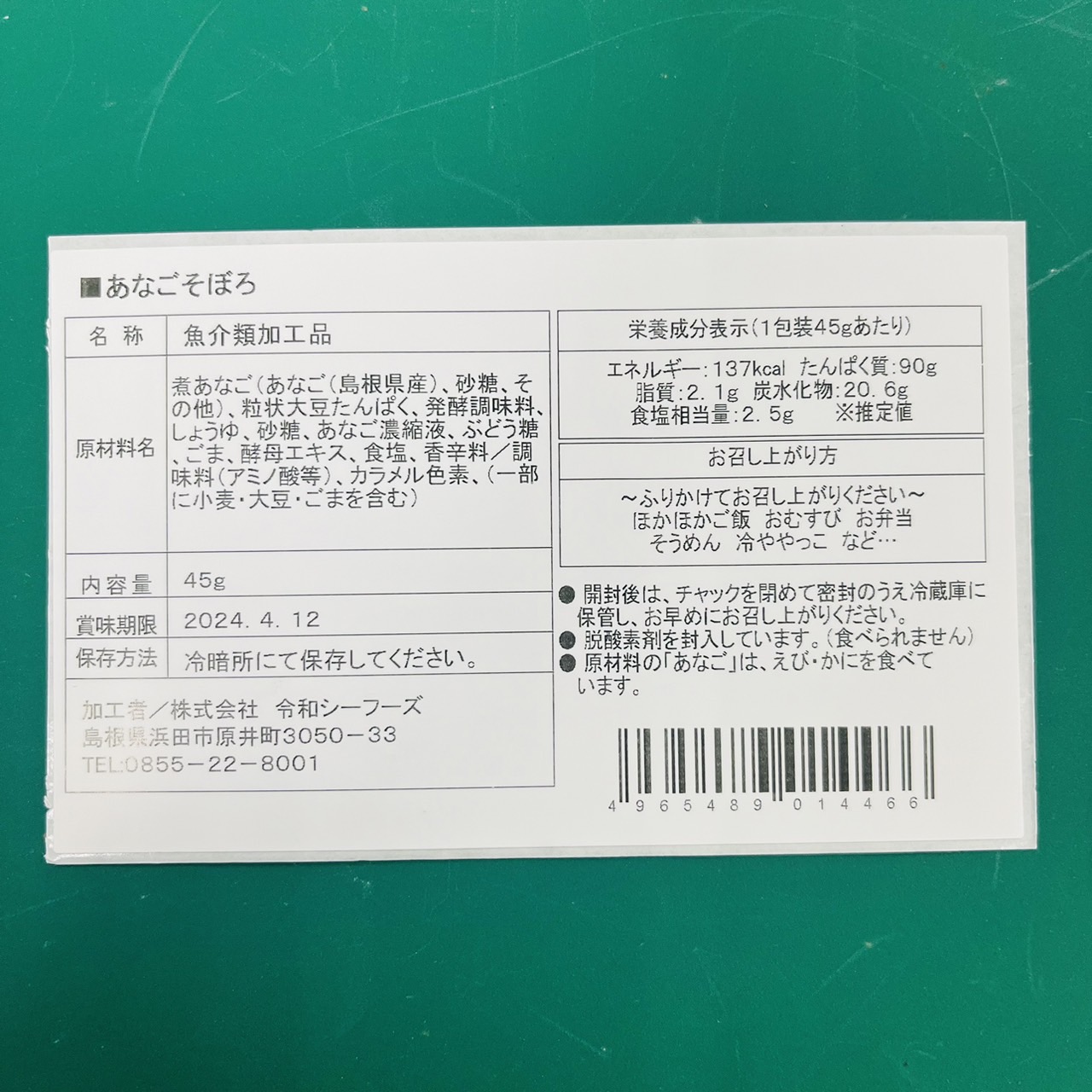 | 原材料 | 煮あなご(あなご(島根県産)、砂糖、その他)、粒状大豆たんぱく、発酵調味料、しょうゆ、砂糖、あなご濃縮液、ぶどう糖、ごま、酵母エキス、食塩、香辛料、調味料(アミノ酸等)、カラメル色素、(一部に小麦・大豆・ごまを含む) |