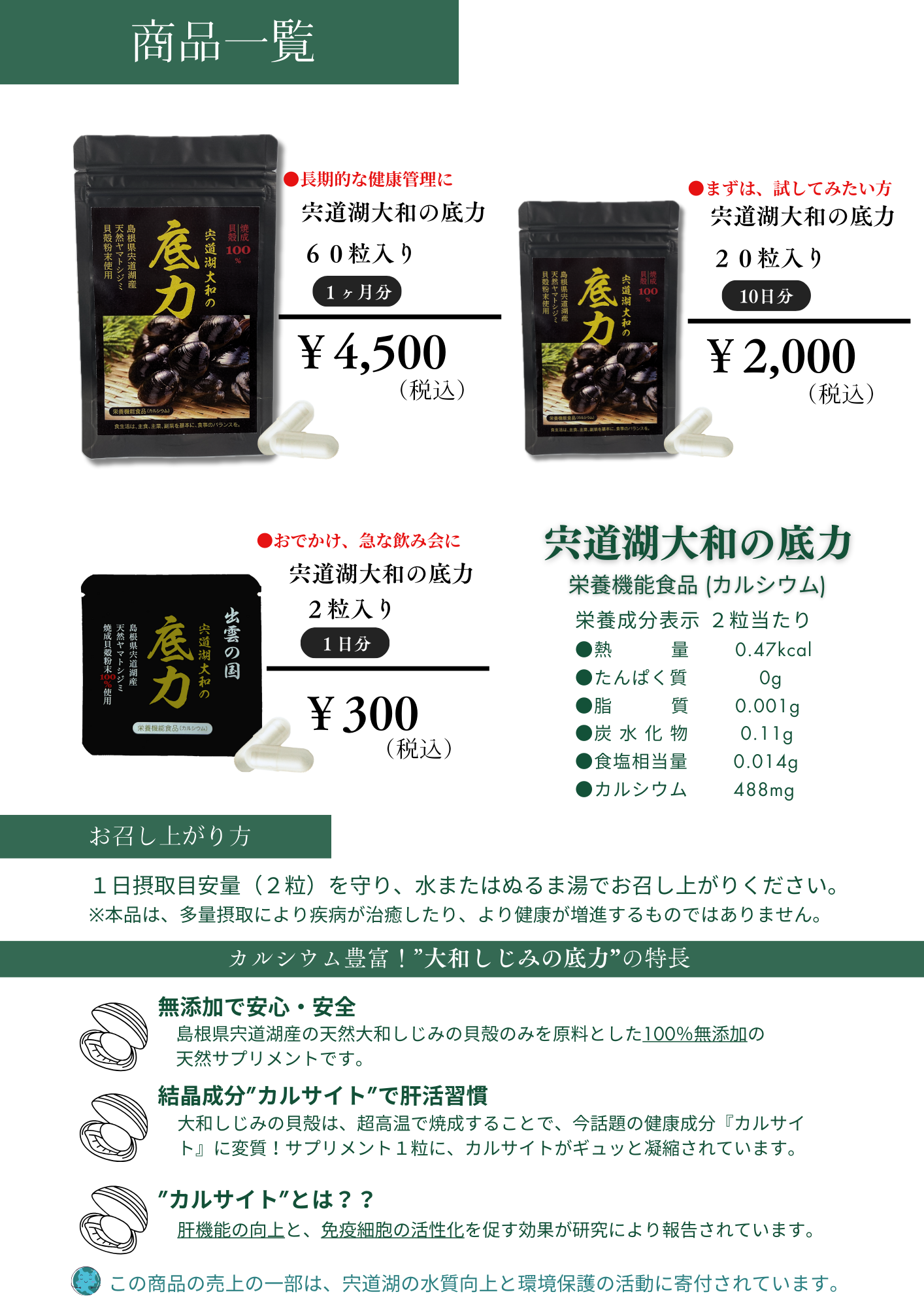 島根県宍道湖産の天然大和しじみの貝殻を原料としたサプリメント。大和しじみの貝殻の成分は、超高温で焼成することで今話題の健康成分【カルサイト】※