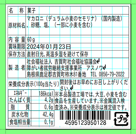 | 原材料 | マカロニ(デュラム小麦のセモリナ)(国内製造)、砂糖、塩(一部に小麦を含む) |