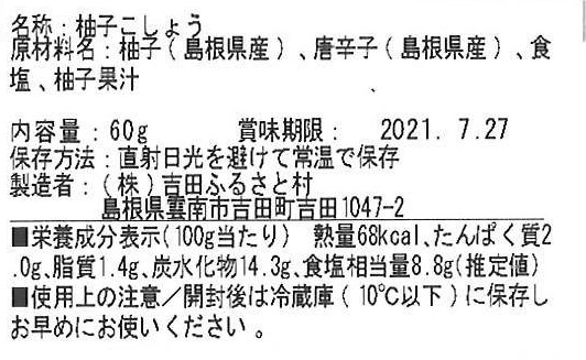 原材料 柚子皮(島根県産)、唐辛子(島根県雲南市産)、食塩、柚子果汁(島根県産)