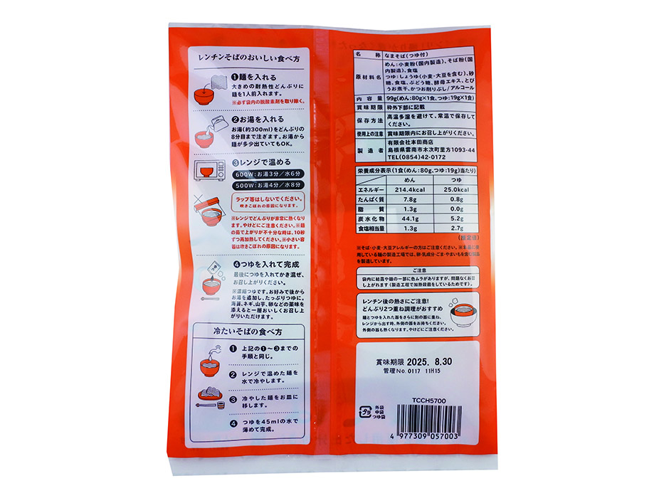 | 原材料 | めん:小麦粉(国内製造)、そば粉(国内製造)、食塩 つゆ:しょうゆ(小麦・大豆を含む)、砂糖、食塩、ぶどう糖、酵母エキス、とびうお煮干、かつお削りぶし/アルコール |