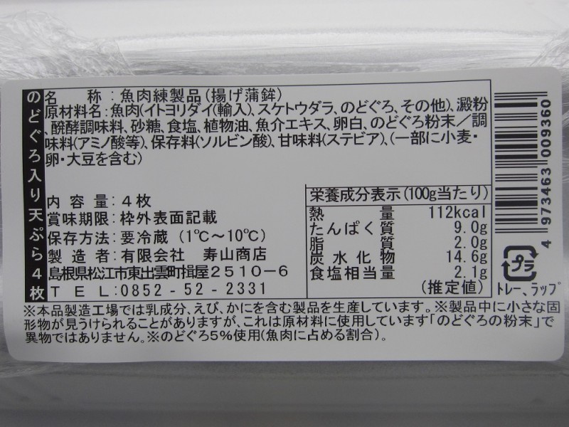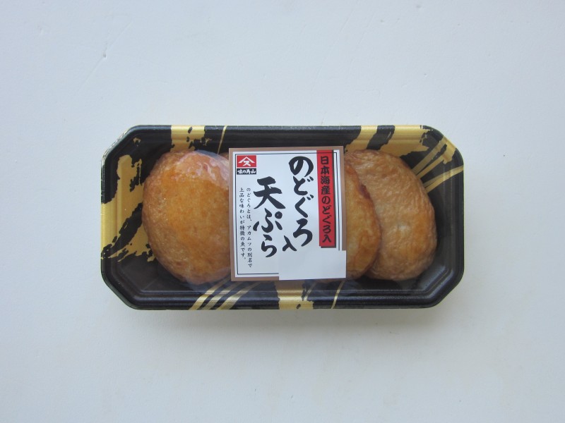 原材料 魚肉(イトヨリダイ(輸入)、スケトウダラ、のどぐろ、その他)、澱粉、醗酵調味料、砂糖、食塩、植物油、魚介エキス、卵白、のどぐろ粉末/調味料(アミノ酸等)、保存料(ソルビン酸)、甘味料(ステビア)、(一部に小麦・卵・大豆を含む)
